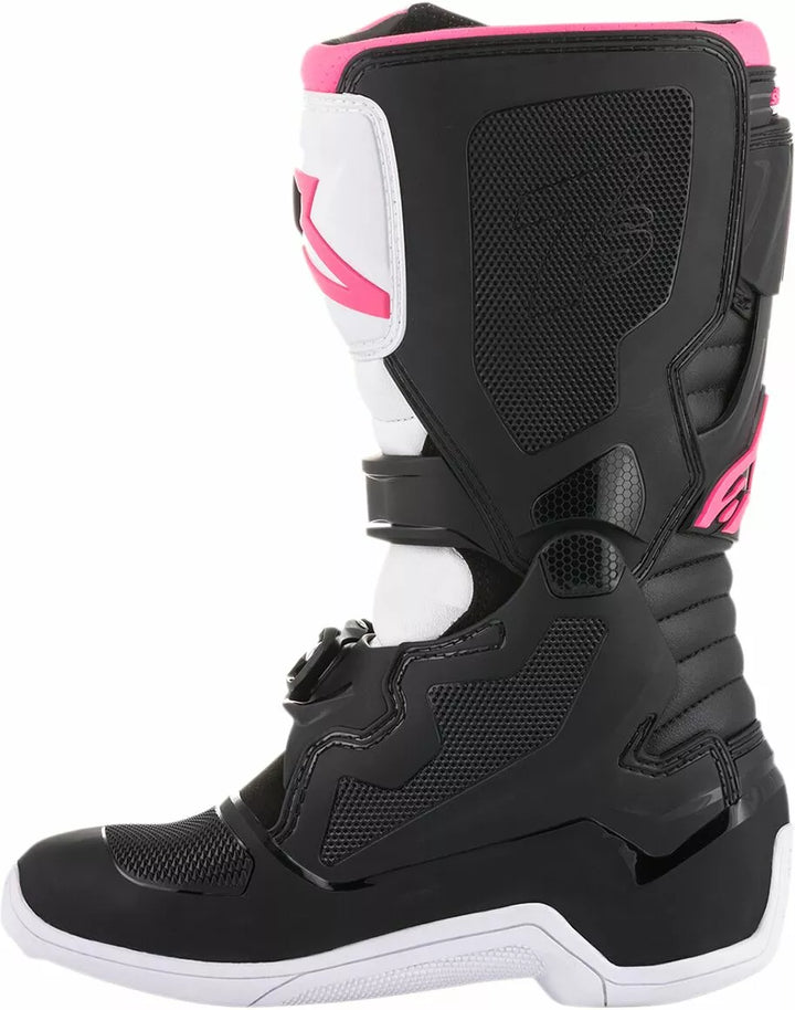 Specific design for women with lower overall height to suit female riders, Calf Circumference is designed to suit the Shape of a Woman's Lower Leg, Ankle Padding Specifically Designed to Follow The More Aggressive Taping of A Woman's Ankles, High-Quality Leather Upper, Poly Fabric Lining and Open Cell Foam, The Inner, Medial Side of The Boot Is Specifically Designed For Control and Features A Thick and Wide Stamped Suede Upper Panel and Pu Protective Lower Section Designed For Excellent Contact and Grip Officer Guard Protezioni di poliuretano termoplastico (TPU) su stinco, area laterale e di punta, vitello, tallone e caviglia esterna per un alto livello di resistenza all'impatto e abrasione e per assorbire gli shock, anatomicamente, a vite a vite Comfort, controllo e supporto, durata a doppia composizione esclusiva nelle aree alti; La suola presenta un gambo in acciaio stampato contornato, la struttura di chiusura è dotata di tre fibbie in alluminio di basso profilo con memoria, autoallineamento, micro regolazioni e un sistema di leasing/bloccaggio rapido; Il design superiore e inferiore inversa-chiusura fornisce un'evitamento dell'impatto superiore e una vestibilità ottimale