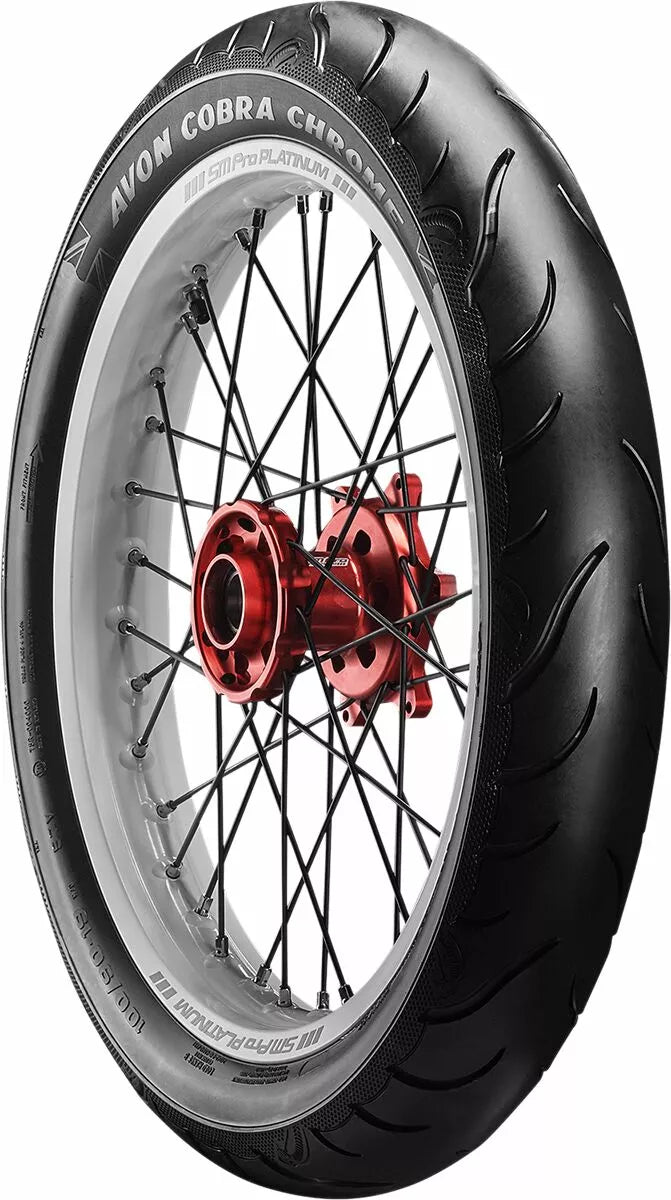 Avon's Latest Tech Pattern and Advanced Construction Produces Over A 5% Larger Footprint Compared To Avon Cobra, High Stability In All Conditions Deliveness Precise Feel and Tire Feedback, Better Traction and Shorter Stopping Distances, Even in the Wet, Incorporates Sports Tirive Longevity ヨ Perfect for Touring, Unique Tire Design with Detaileled Aesthetic Features, Improved Tire Life Over ITS Precessor, Snakeskin-Effect Treat, Reinforced, Aimed at the Power Market Cruiser/Touring/Custom.