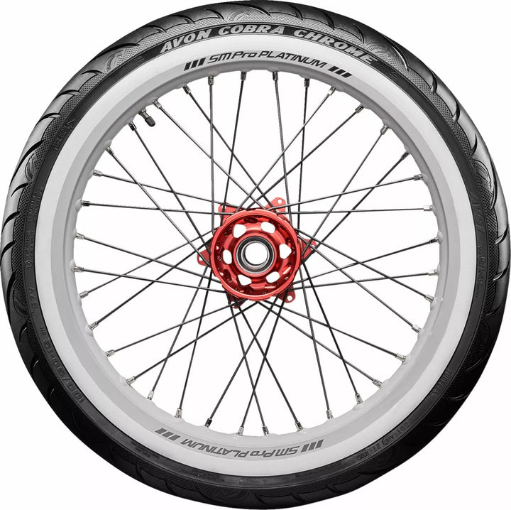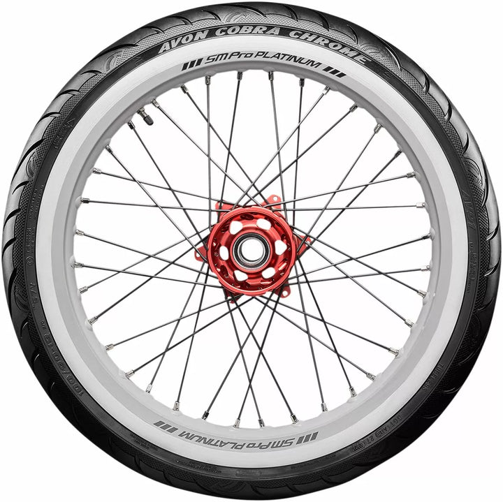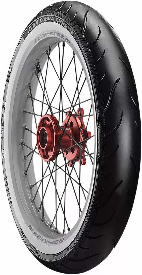 Avon's Latest Tech Pattern and Advanced Construction Produces Over A 5% Larger Footprint Compared To Avon Cobra, High Stability In All Conditions Deliveness Precise Feel and Tire Feedback, Better Traction and Shorter Stopping Distances, Even in the Wet, Incorporates Sports Tirive Longevity ヨ Perfect for Touring, Unique Tire Design with Detaileled Aesthetic Features, Improved Tire Life Over ITS Precessor, Snakeskin-Effect Treat, Aimed at the Power Market Cruiser/Touring/Custom.