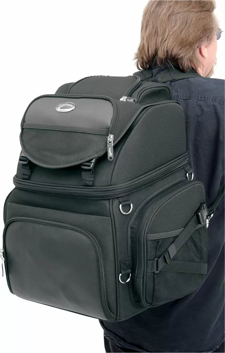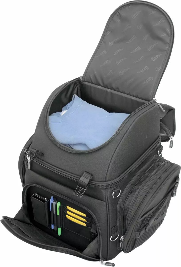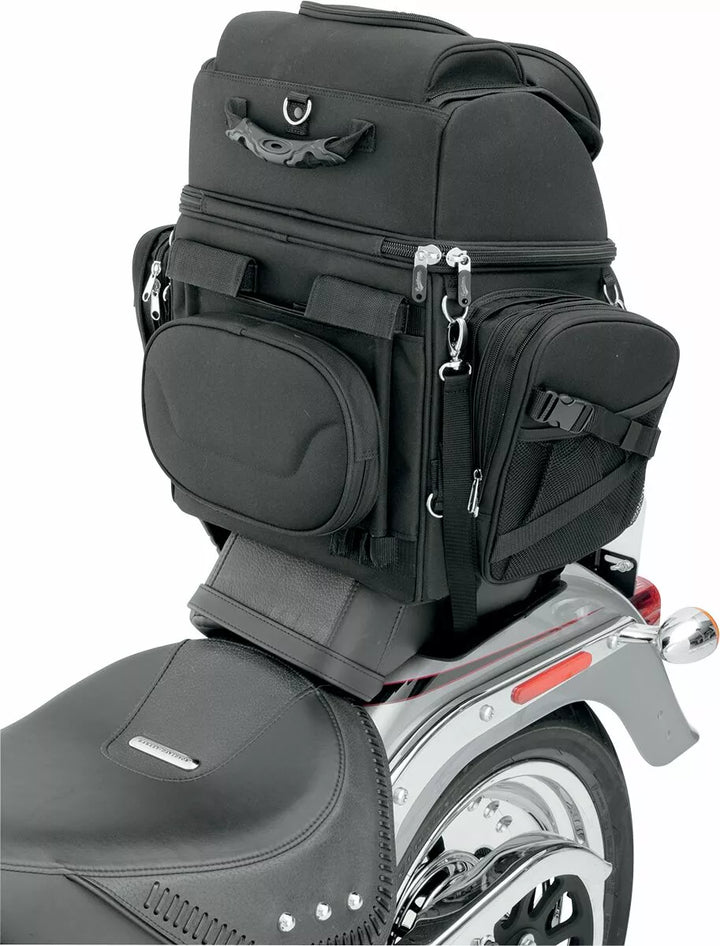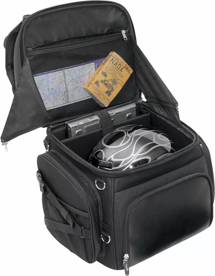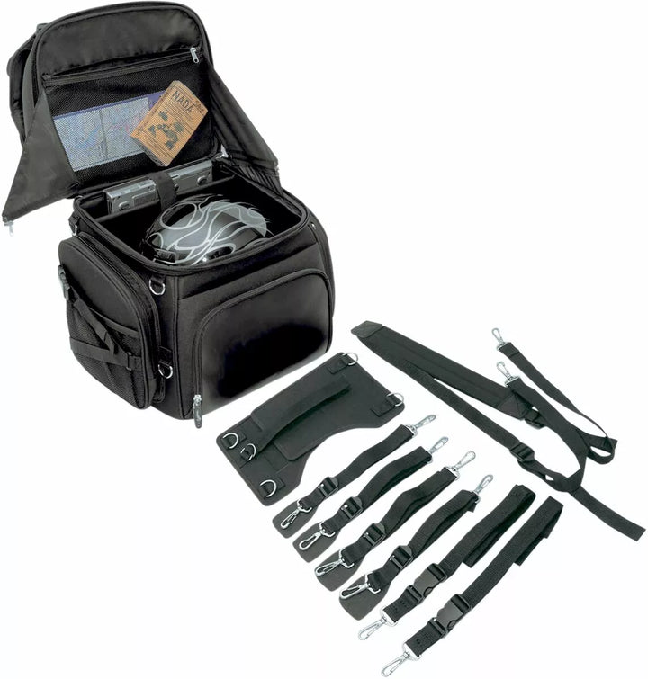 Due sistemi di montaggio inclusi: il giogo e il cablaggio "Versa-Mount" di Saddlemen, e un sistema di cinturini a barra da sissy regolabile che attacca facilmente la borsa al sedile della motocicletta, al portapacchi o alla barra di femminuccia, è possibile regolare le cimpastre per l'opportunità di bocconcine Espanso per una maggiore capacità, cinque tasche a maglie esterne e due esterne Gli elementi, il lembo esterno superiore può essere regolato per trasportare una giacca, mini-padlock, con chiavi extra, aiuta a fissare le cose nella borsa, la forma della sacca per mantenimento della struttura interna ed è abbastanza forte da appoggiarsi, anche quando em da 14 "pollici (55,72 L) capacità di carico;