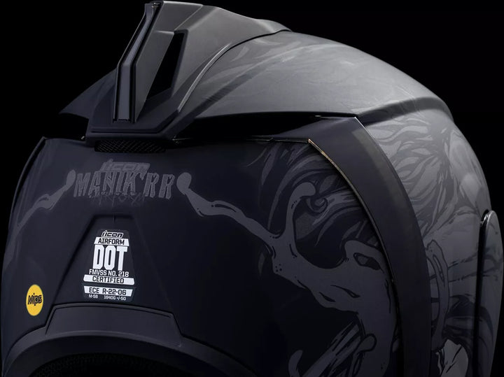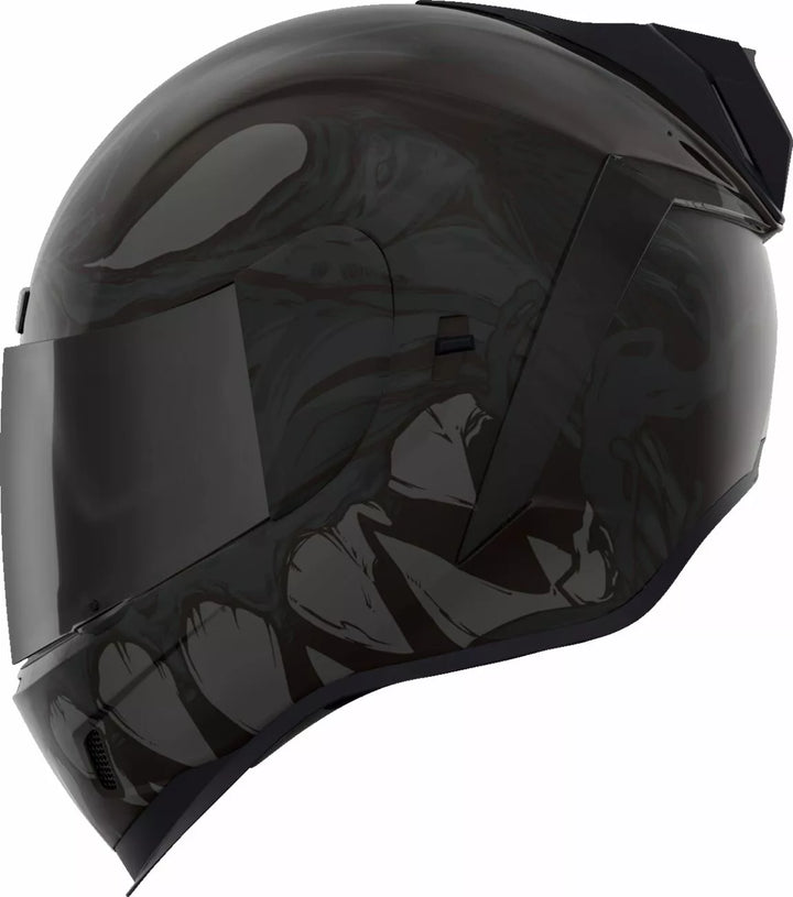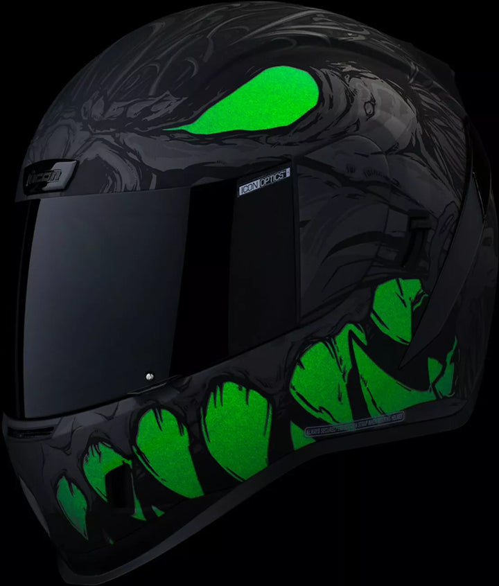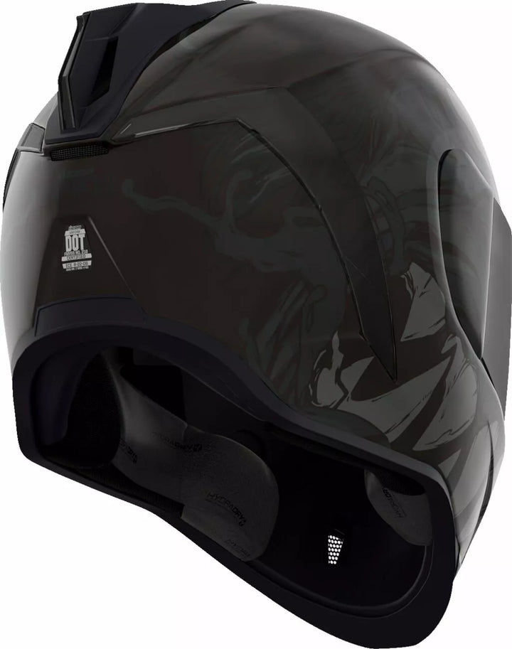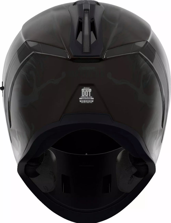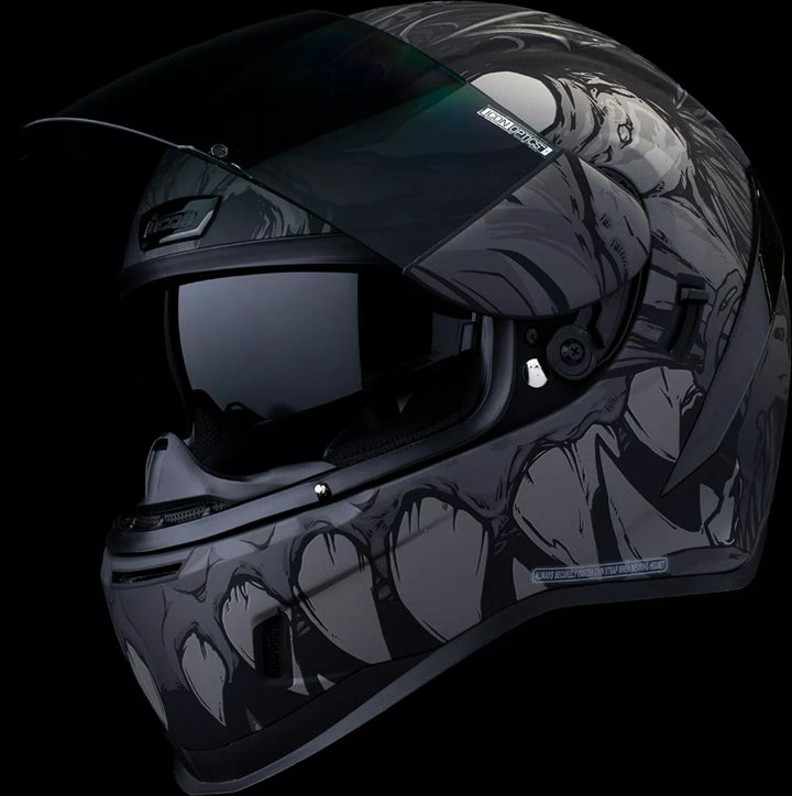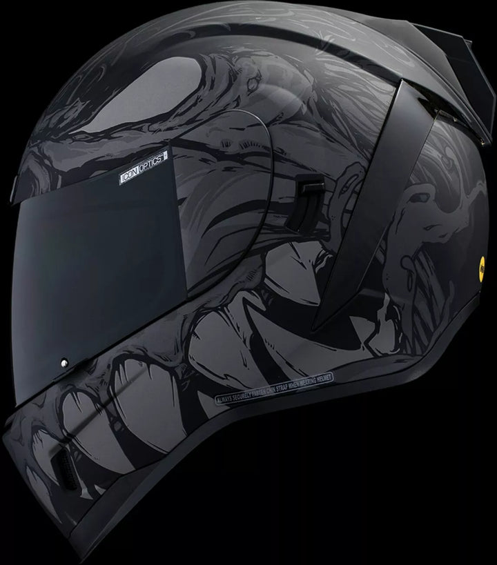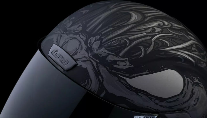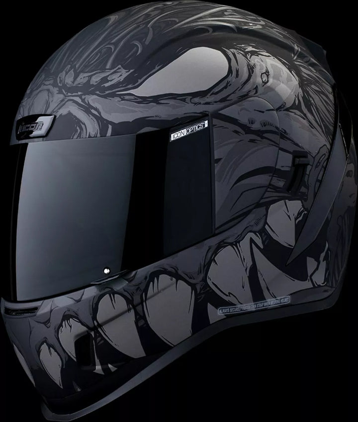 Sistema di sfiato continuo, scudo icon Optics ™ senza FAG con sistema a rilascio rapido ™, guscio di policarbonato stampato ad iniezione per resistenza, geometria del flusso d'aria interno, rotolo di collo scolpito, prolock ™ switsch, esterno con la vigilia di swequ a chiusura a bloccare la vigilia dello swequ Rilegatore, tasche per altoparlanti interni funzionano con R.A.U. di ICON Dispositivo Bluetooth, include Dark Smoke Dropshield ™ e Rubatone Black SpeedFin ™