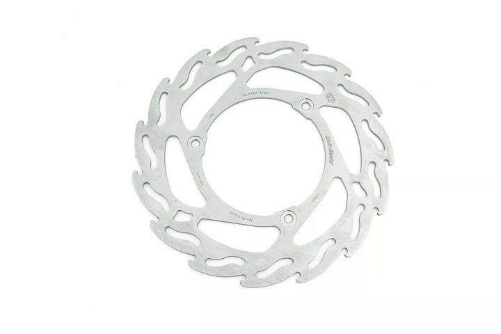 Slot di valenting a forma di fiamma e perimetro esterno assicurano una quantità uguale di superficie di contatto tra la pastiglia del freno e il disco in tutta la rotazione dell'OMS del disco., Azione di frenata liscia e più prevedibile che consente di frenare più forte. Double-grending per un adattamento e piattalità perfetti, per le migliori prestazioni, consigliamo di utilizzare i freni Moto-Master con il composto di pad coordinati che si adatta meglio al tipo di guida.