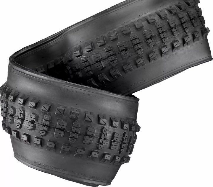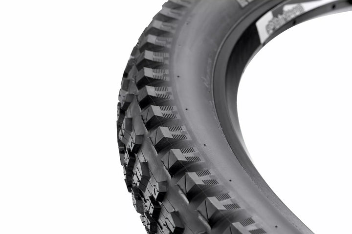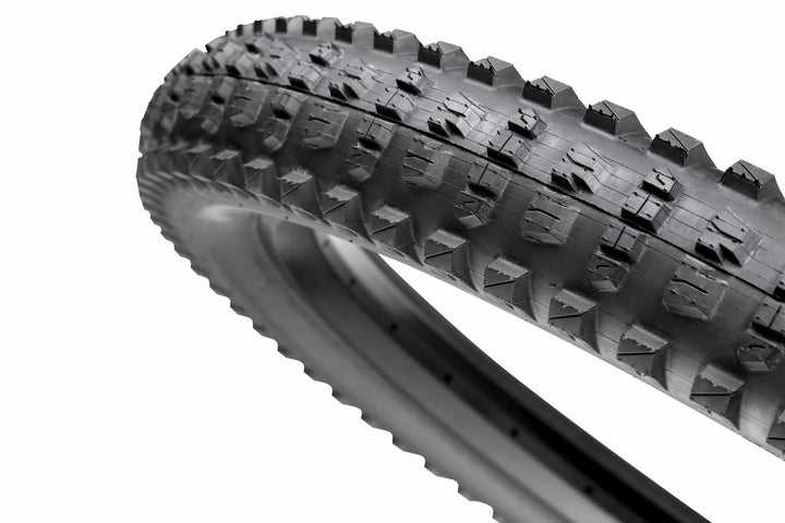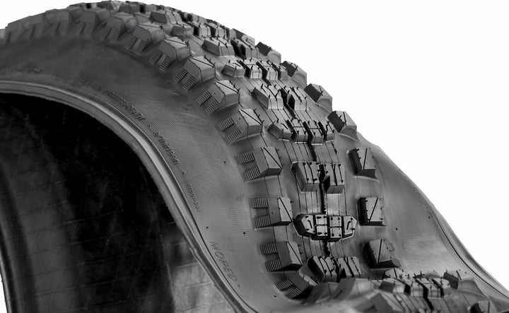 Progettazione specifica E*di grande volume per ebike., Opzioni del caso pesante., Composto ad alta efficienza per una migliore velocità di usura e durata della batteria., Tratta aggressiva per i pesi aggiunti e la potenza dei piloti EMTB Trail. Pressione di inflazione più bassa.
