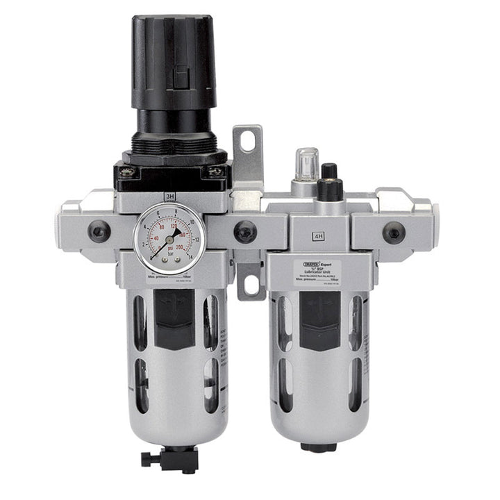 Unità di trattamento dell'aria, raccomandata per compressori> 200 L. Progettato per controllare la pressione dell'aria di uscita, eliminare l'umidità e i contaminanti dal flusso d'aria e per gli strumenti lubicati durante l'uso. Consegnato con fissaggio a parete e manometro. Pressione: 0 a 10Barsentry/output Tre: 1/2 "