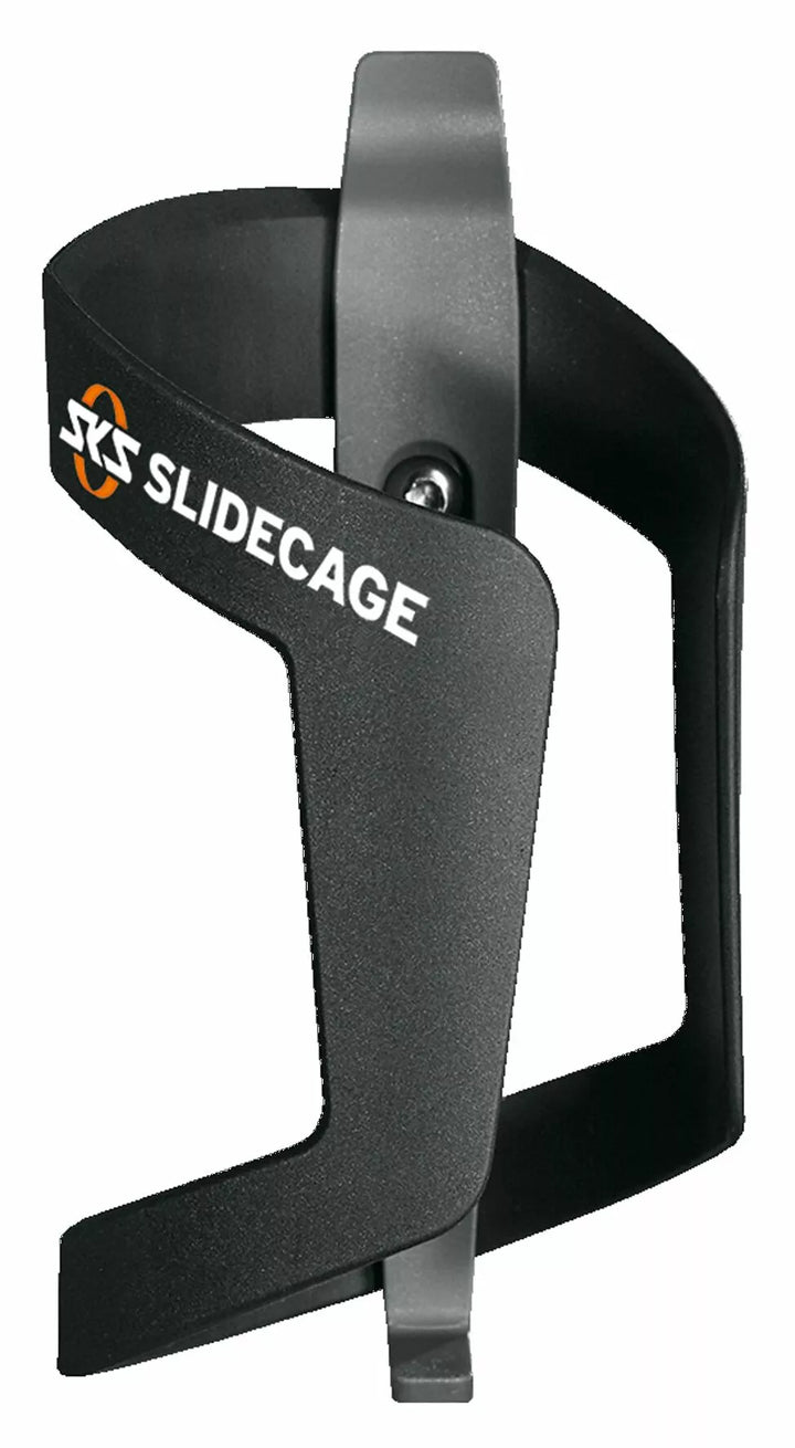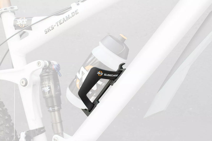 Porta della bottiglia d'acqua per biciclette per l'inserimento della bottiglia sinistra e destra., La bottiglia da bere può essere rimossa dalla parte superiore ma anche dal lato della gabbia della bottiglia di slidecage SKS. Ciò è particolarmente usoso per i fotogrammi che vittima di spazio minimo nel triangolo del telaio. La gabbia della bottiglia è realizzata in plastica leggera (49 g), ad alta resistenza e può essere montata per utenti sia a sinistra che per la mano destra semplicemente collegandola a infan.