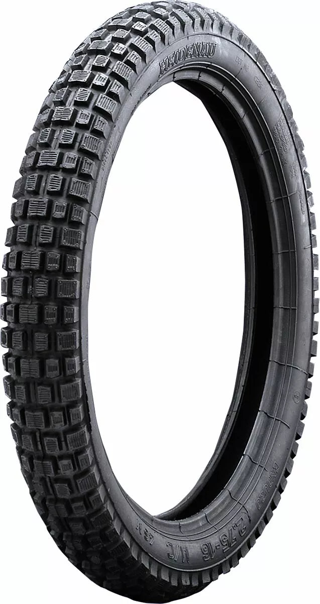 Enduro vintage, look classico con un modello di trattamento a blocchi, buona stabilità creata dal design del profilo, tipo di tubo (TT), blackwall, classificato M per velocità fino a 130 km/h (81 mph)