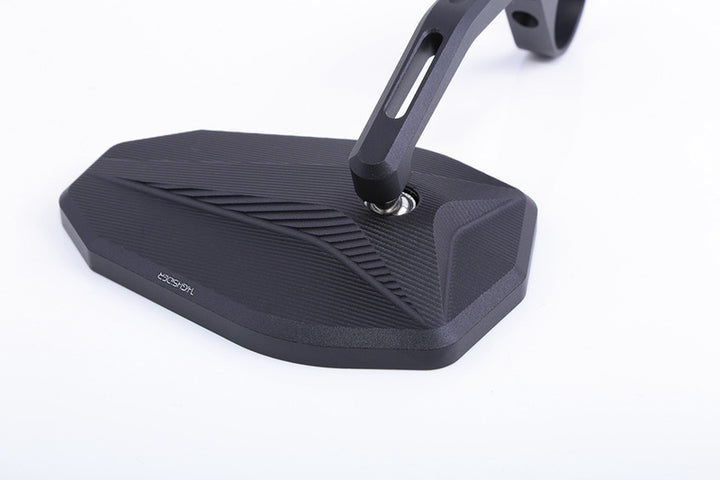 Un elegante specchio nudo con una testa di alluminio anodizzato nero. La superficie dettagliata elaborata da CNC con tracce fa apparire Highsider Victory-X ancora più sofisticato e dà alla forma senza tempo un nuovo punto culminante ottico. Adatto a 1 pollice (25,4 mm) e 7/8 pollici (22 mm) il manubrio e può essere utilizzato sia sul lato sinistro che a destra. E-approvato.
