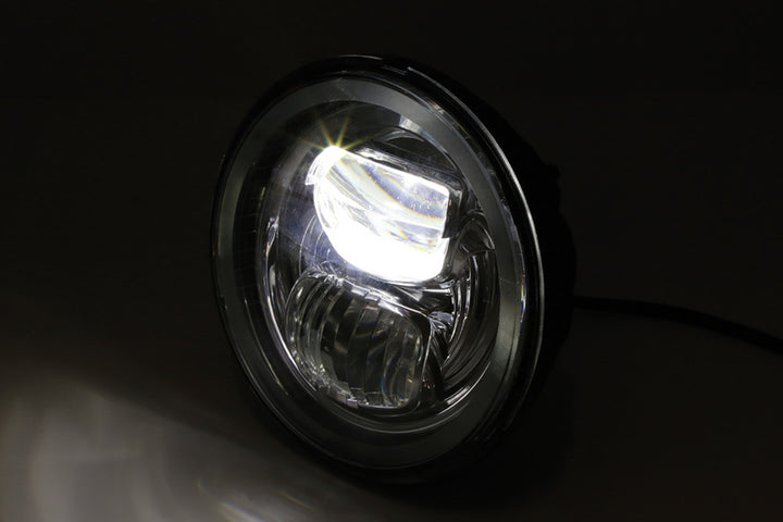 Questo riflettore rotondo, nero o cromato ha raggio alto, raggio basso e anello di luce di parcheggio. Il raggio basso è illuminato nella metà in salita dell'inserto e quando il raggio alto è acceso, entrambe le metà sono illuminate.
