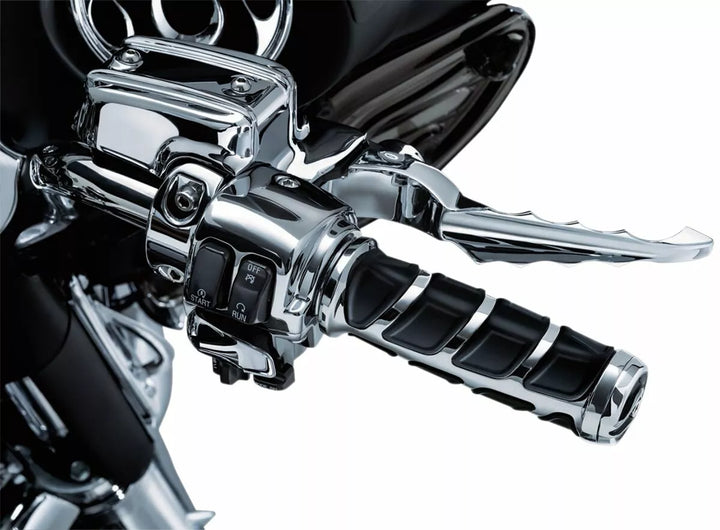 Progettato per continuare ad andare avanti con le più recenti tecnologie di styling e vibrazione, presentano un corpo in alluminio e inserti in gomma EPDM per aiutare il guidatore a guidare con meno stanchezza e un maggiore controllo in un design moderno, un diametro esterno leggermente più piccolo rispetto al design ISO ル -grip, non compatibile con il boss Iso-Throttle o altri accessori che si avvicinano per afferrare la fine con motivi a quattro buchi