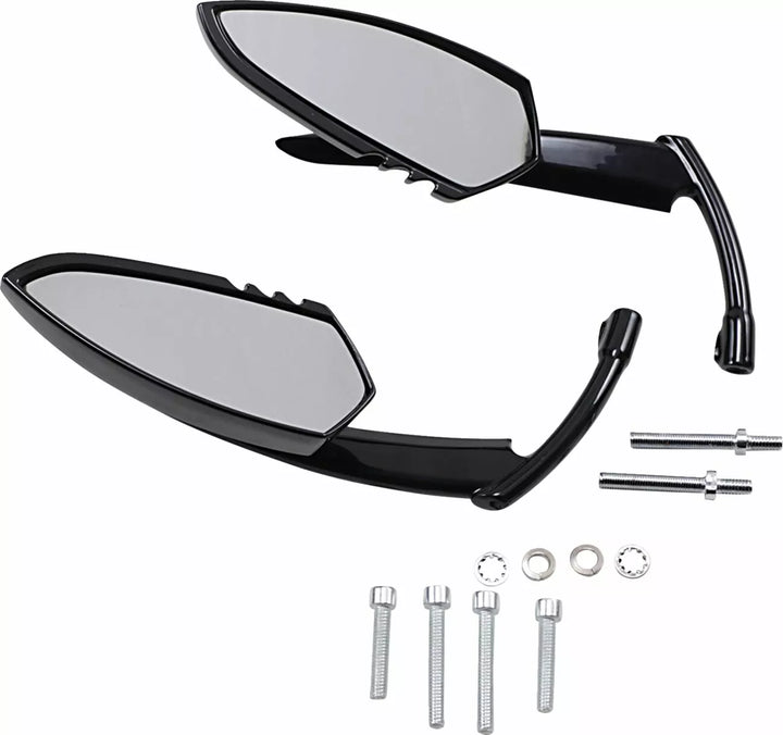 Lo stelo speculare evoca l'aspetto di una falce., La testa specchio ricorda un coltello di sopravvivenza., La testa dello stelo e dello specchio sono unite da un meccanismo di giunzione a sfera e socket a operazione liscia per una facile regolazione., Le misure della testa dello specchio misure 5-1/2/2 "x 2".
