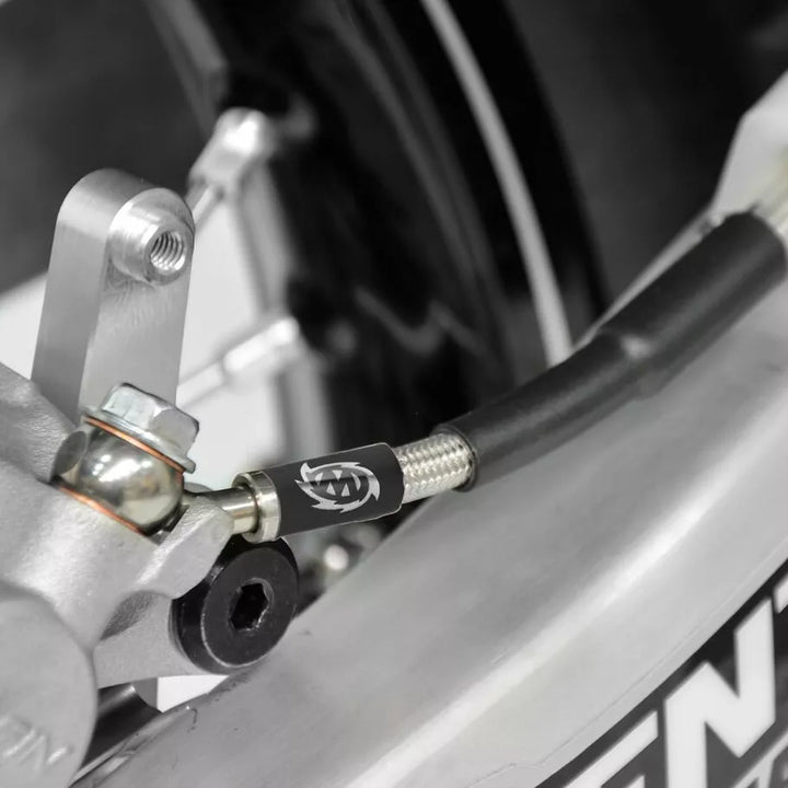 La fodera del tubo PTFE con una treccia cablata in acciaio inossidabile che è protetta da un rivestimento in PVC durevole e leggero., Vengono utilizzati i banjos in acciaio inossidabile per eliminare qualsiasi possibile corrosione. Istruzioni., Le linee del freno intrecciate inossidabile eliminano quella sensazione spugnosa delle linee di freno di plastica standard.