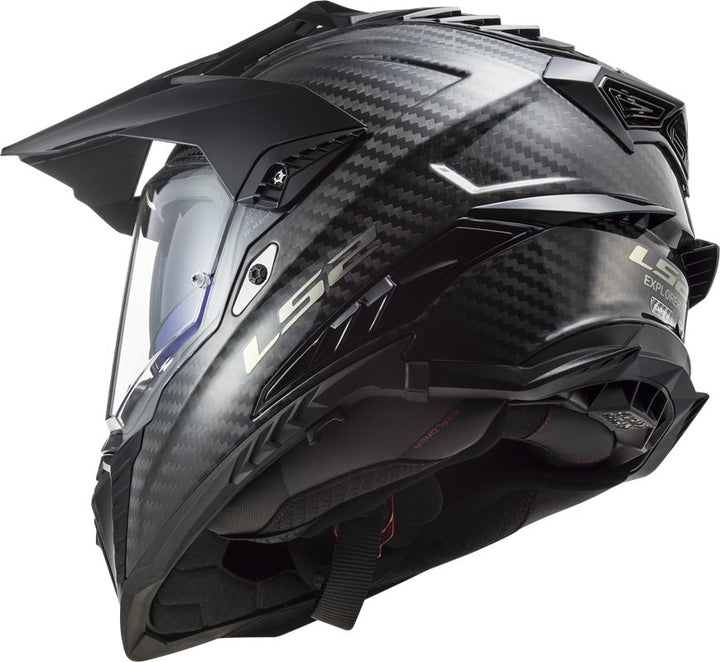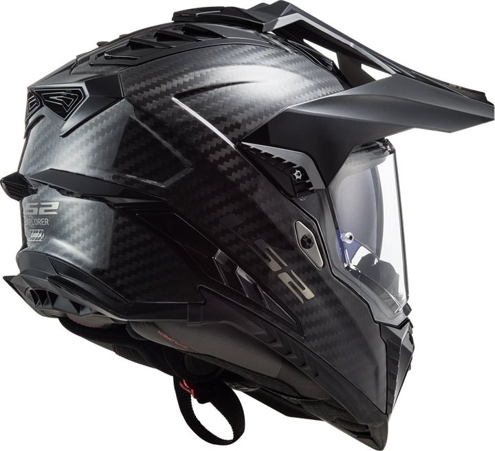 LS2 Adventure MC Helmet Explorer Carbon offre un'eccezionale combinazione di sicurezza, facilità e comfort, rendendolo una scelta eccellente per i conducenti che cercano un casco affidabile e versatile per lunghe rotte di avventura su tutti i tipi di substrato.