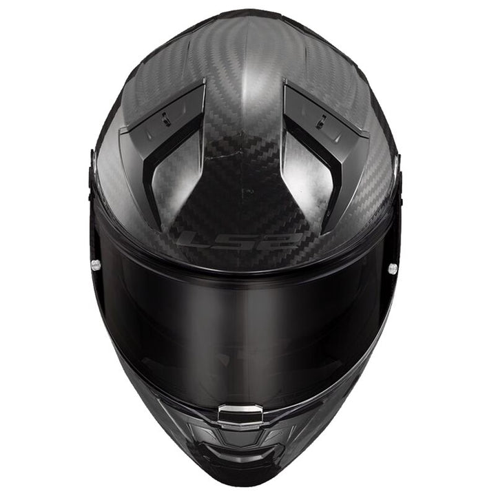 Frontal vy av LS2 Integral Mc-Hjälm Vector II Carbon Svart med kolfibermönster och ventilationsöppningar för förbättrad komfort.