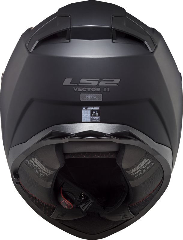Baksida av LS2 Integral Mc-Hjälm Vector II Matt Svart med märkning och ventilationsöppningar för förbättrad luftflöde och komfort.