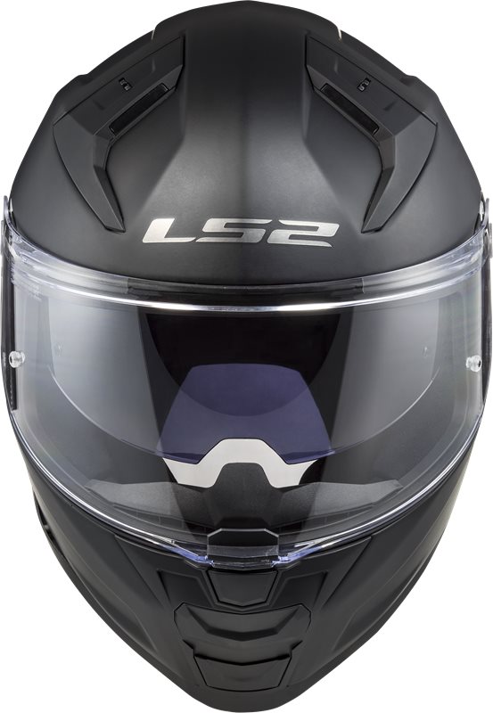 Frontal vy av LS2 Integral Mc-Hjälm Vector II Matt Svart med ventilationssystem och klar visir för optimal säkerhet och komfort.