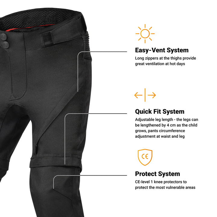 Ozono Kids Union sono una coppia pantaloni motociclistici funzionali e protettivi per i bambini, Perfetto sia per la guida in città che per i viaggi più lunghi. La membrana impermeabile, i materiali durevoli e la regolazione della lunghezza intelligente consentono di utilizzare i pantaloni per diverse stagioni.