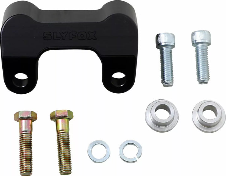 Realizzato in alluminio 6061-T6, consente il montaggio di alti riser o barre T mentre si mantengono la posizione del modulo di scartamento di serie, sostituisce il montante e il morsetto esistenti; I supporti con hardware esistente, i fori di montaggio del montante da 3-1/2 "su centritore 1/2", realizzati negli Stati Uniti, il coperchio di montaggio del calibro deve essere modificato per consentire il montaggio del riser/T-bar., Richiederà il trasferimento dell'interruttore di accensione o l'eliminazione dell'accensione con il flash CVO.