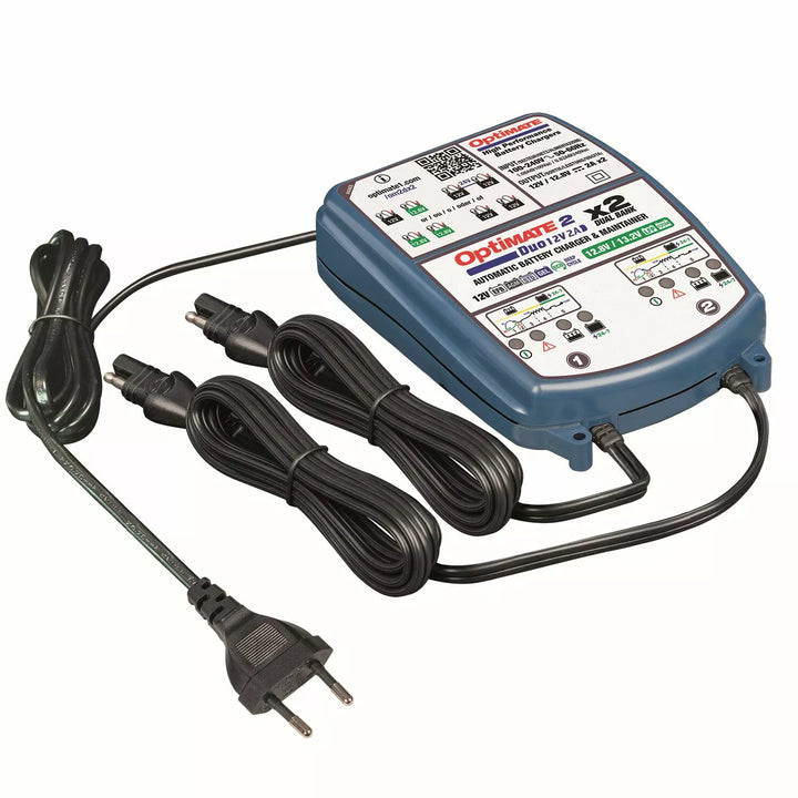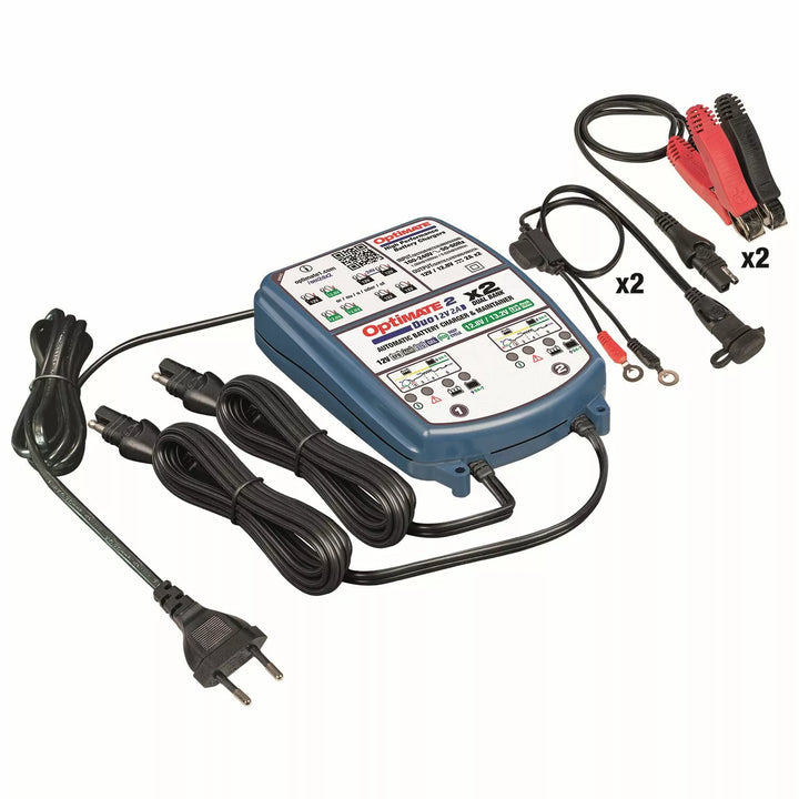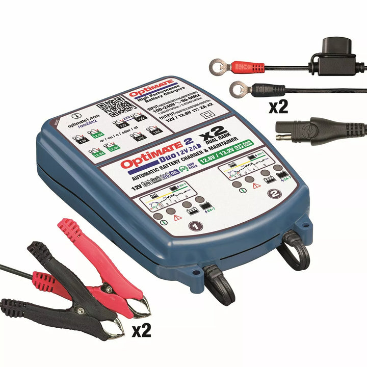 Opticare 2 duo x 2 Bank Bronze Series: 5-Step 12V / 12.8V 2A SEGUEDER BATTERIA SEGUITO X2., Il potente batteria a 2 banchi "No Brain" MainAiner per la batteria Hi-Technology in nessuno dei tuoi veicoli. Garantisce batterie sane di litio o acido piombo! Le batterie sono sempre pronte per l'esecuzione., Fornisce 2 amplificatori di carica consigliati per la manutenzione di batterie più grandi., Cariche e erogare manutenzione a lungo termine. Connettiti alla batteria e Optime 2 Duo Dual Bank non fa il resto, nessuna supervisione richiesta!, Duo: Adatta automaticamente alla batteria PB o LFP., Sicuro per lasciare connesso. Protezione elettronica completa., 24 ore su 24, 7 giorni su 7: mantiene la batteria a piena carica e buona salute. Avvio a basso volt di 4v., Viene rilevato un danno alla batteria avverte. Potenza stand-by inferiore a 0,5 W ed efficiente 24-7 manutenzione della batteria., IP54: resistente alle intemperie. Valutazione per l'uso fino a -40 ° C / -40 ° F.