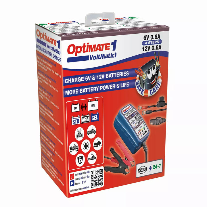 Opticare 1 serie di bronzo voltmatico: caricabatterie e manutentore a 4 V / 12V 0,6A. Gel)., Fornisce 0,6 amplificatori di carica consigliato per la manutenzione di batterie più piccole., Cariche e fornisce manutenzione a lungo termine. Connettiti alla batteria e Optime 1 Voltmatic non fa il resto, nessuna supervisione richiesta., Voltmatico: selezione della modalità di carica 6 V o 12 V in base alla tensione della batteria., Plug a prova di polvere in stile Case., Sicuro per lasciare la salute elettronica completa di salute elettronica. Tecnologia verde., Tecnologia di risparmio energetico -stand -stand da potenza inferiore a 0,5 W -efficiente 24-7 manutenzione della batteria., IP50: resistenze meteorologiche -ratato per l'uso fino a -20 ° C / -4 ° F.
