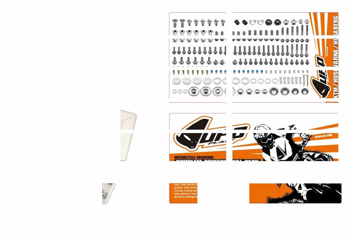 Kit hardware in stile fabbrica Fastens: tutto in plastica, sotto-frame, sistema di freni, tubo di scarico, guide a catena, pignone, piastra e guardie, coperture di cassette, morsetti tripli, supporti a barre, sistema di raffreddamento, bulloni di pizzico di axel, sedile e altro ancora