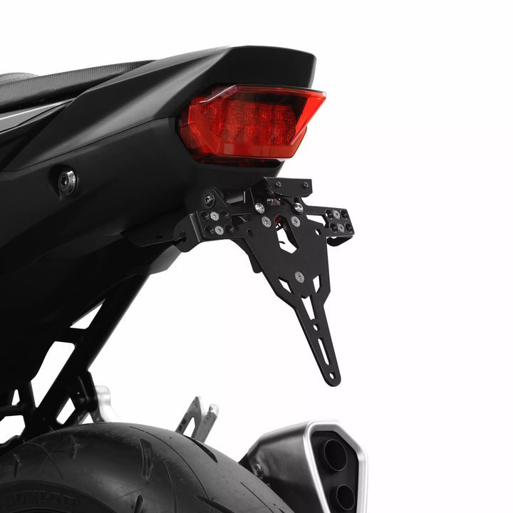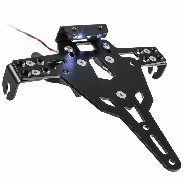 Il portafoglio di licenza è estremamente resistente e a prova di meteorologi., Polveri neri rivestiti. , Il supporto della targa può essere utilizzato per qualsiasi tipo di targa (larghezza di 175 mm)., Nessuna modifica della carenatura richiesta., Regolazione in coda dell'angolo di rastrello., Supporto indicatore regolabile in 3 posizioni. Piastra., I supporti per luce indicatore speciale (venduti separatamente) richiesti per le luci degli indicatori di stock., Kit include: 1 supporto per targhe incl. Kit di montaggio., Luce di licenza a LED "E Approsded" incl. Supporto., Back light con supporto. Di: Germania, Slovenia, Croazia e Regno Unito.