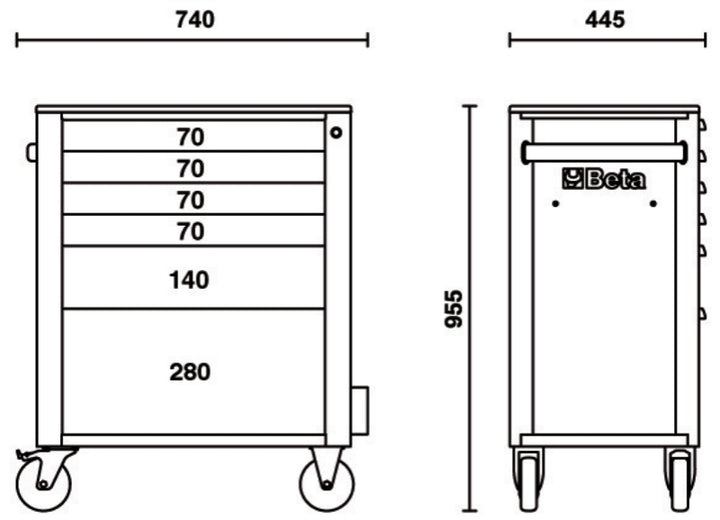 Main Features: Six drawers (588x367 mm) With Ball Bearing Slowes: 4 Drawers, 70 mm high1 drawer, 140 mm high1 drawer, 280 mm highdrawer bases protected by foamed rubber Mats.four Castors 125 mm in in Ø: 2 Fixed and 2 Fixed and 2 Stey Lock.static LOAD CAPACITY: 800 kg.Thermoplastic worktopintegrated Side Bottle Holder.740x445x956mm