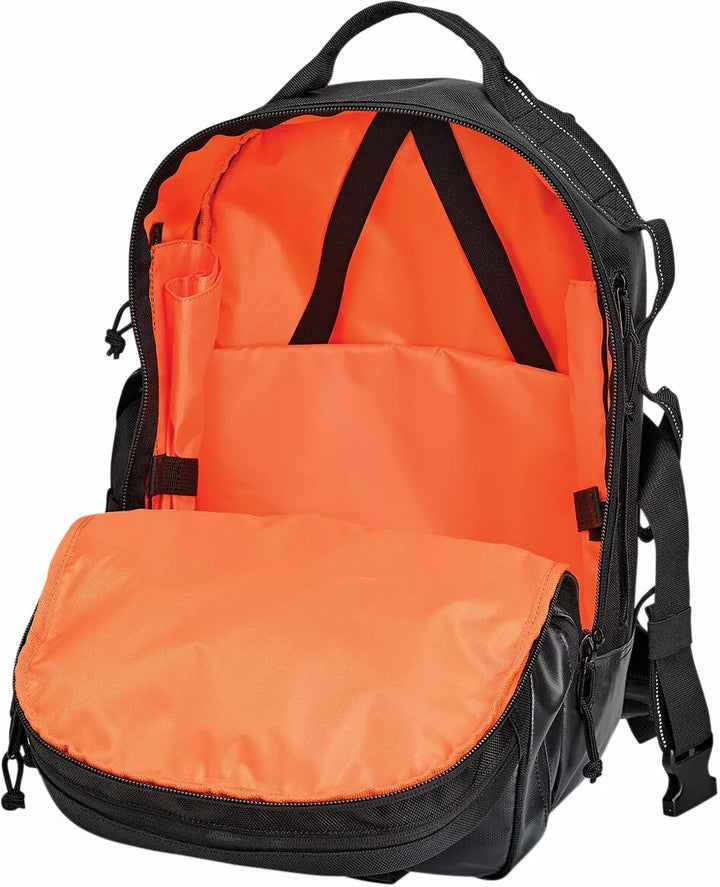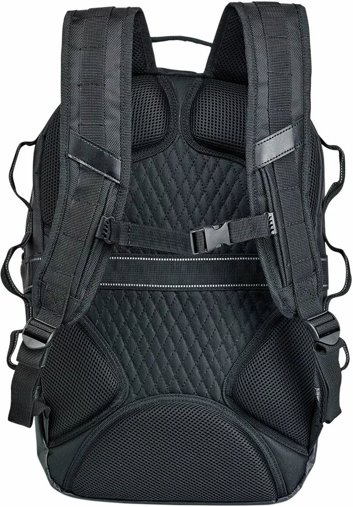 1680 Denier Ballistic Nylon Outer Chassis With PVC Coating Outer Shell, PVC-Treated Heavy-Duty Bottom and Lower Side Panel's Resist Water and Dirt, Padded Laptop Sleeve With Elastic Retainers in the main compartment, Upper exterior Compartment Molded Nylon Buckles on Cinch Straps For Speedy Mounting on Sissy Bars, External Straps Can Be Used to Add a Bedroll, Jacket or Skateboard to the Bag, 6 Heavy-Duty, Bar-Tacked Lashing Points for Loading and BioMING Options, Padded Should and comfort, Holds 48 - 12oz Cans