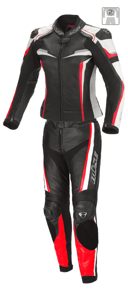 Buse Dam Skinnställ 2-delat Mille i svart och rött med vita detaljer. Utrustad med SAS-TEC skydd och elastiska insatser för optimal säkerhet och komfort.