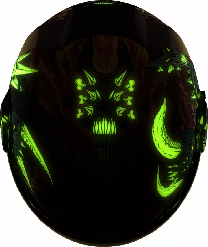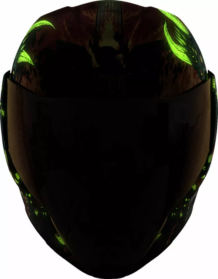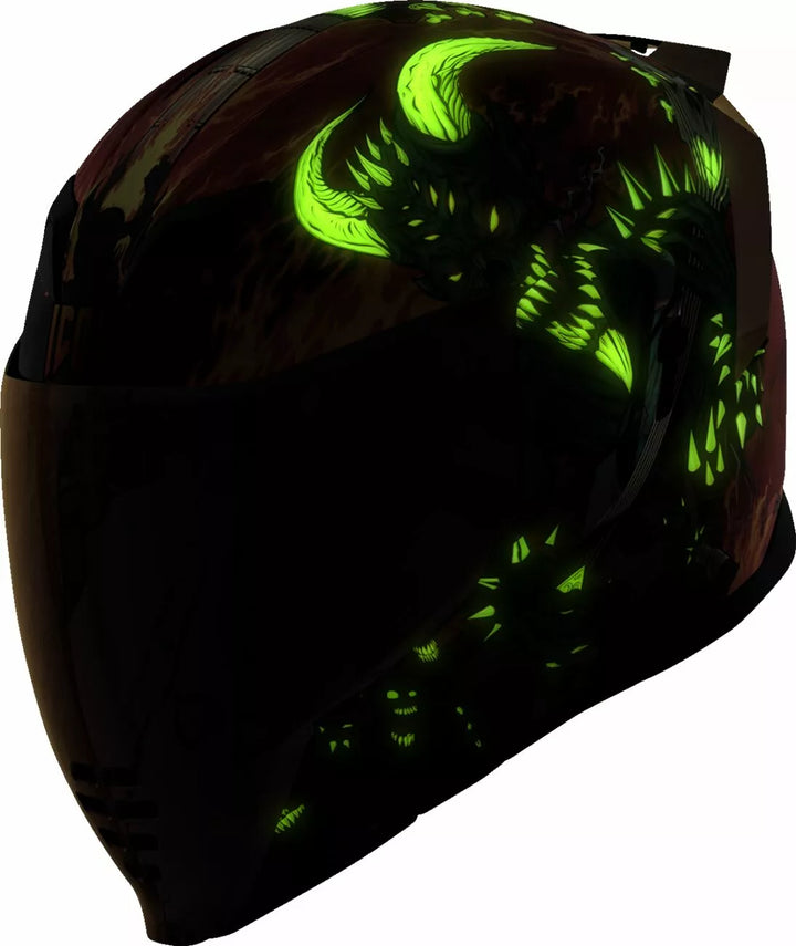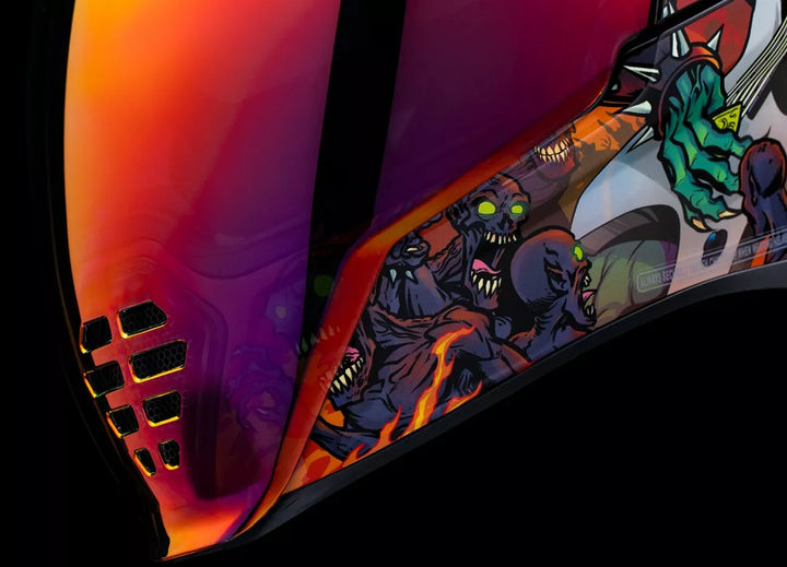 Removable Molded Breath Deflector and Chin Curtain, Injection Molded Polycarbonate Shell for Strength, FAG-FREE Dropshield ™ with Exterior Switch, Recessed Twin Channel Supervent Cooling System, Multiple Oversized Intake Ports Side Plates, The Dropshield ™ Visor Must Only Be Used While the Main Face Shield Is In The Fully Closed Position, Removable Hydradry ™ Moisture Wicking Liner, Glow in the Dark, Internal Speaker Pockets Work With Icon's R.A.U. Bluetooth Device, Includes Clear & RST SUNSET FOG-FREE FLITESHIELD
