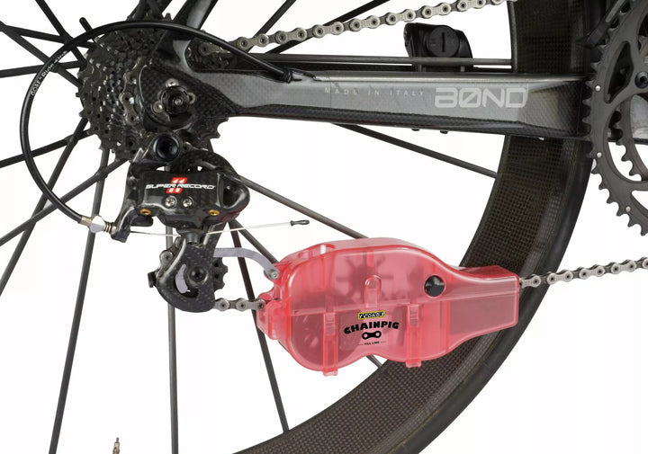 The Chain Pig II Provides A Simple, Efficient, and Effective Way to Clean The Chain Without Making a Mess or Wasting Valuable Degree., The Upper and Lower Bodies Are Made From Super-Strong, Chemic and Impact-Resistant Steel Plastic and the Chain Pig Pig Other Improvements, to Further Increase Durability., The Brush Wheels, which have the Toughest Job in any Chain Cleaner, Feature Larger Diameter Bristles Optimized for Stiffness, Effective Cleaning Performance, and Duability. Stage One Brushes Pull Degreaser Up From The Reservoir and Onto The Chain., The Chain Is Then Scrubbed From All Angles and Finally Pulled Through a Large Durable Sponge that Wicks Excess and Contaminated Fluid from the chain minimizing mess Larger Contaminants, and Returned USable Degreaser Back for More Cleaning., Works on 1-13 Speed Chains., Free the Chain Pig II from His Pigen and Watch Him Devour Chain Grime as Only a Pig Can! The Pigen Contains The Chain Pig, A Bottle of Degreaser/Cleaner (20 ml), a Bottle of Dry Lubricant (20 ml) and a Gear Brush!