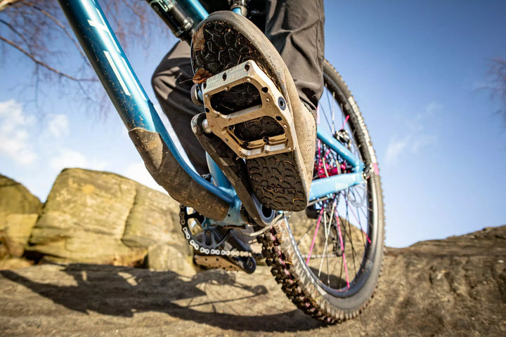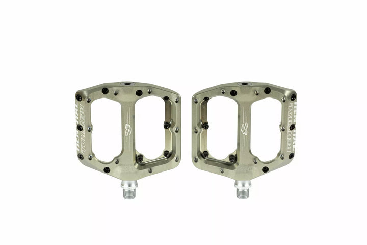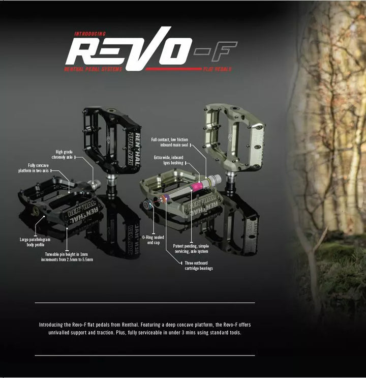 Introducing the Revo-F Flat Pedals From Renthal. , Featuring a deep concave platform, The Revo-F Offers Unrivalled Support and Traction., Large Parallelogram Body Profile., Tuneable Pin Height in 1 mm Increments from 2.5 mm to 5.5 mm., High Grade Chromoly Axle. IGUS BUSHING AND FULL CONTACT AND LOW FRICTION INboard Main Seal., Plus, fully serviceable in under 3 mins using standard tools.