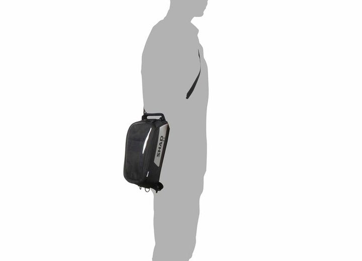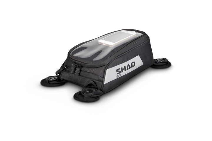 SHAD presents to the market its new line of SL touring bags. With high resistance and quality, the range meets regulations RoHs and Reach. With an attractive design, 100% Barcelona Design. They also have large reflective elements for greater security. Compact tank bag with reflective elements to increase security. It includes an upper compartment with touch screen for Smart Phones. Fixed to the bike with 4 removable magnets. Features: • Zipped main compartment, featuring an inner mesh pocket with elastic closure. • Zipped outer pocket. • Zipper with resistant pullers suitable for use with gloves. • Cushioned carry handle. • Adjustable shoulder strap. • Upper compartment with touch screen for up to 6” screen Smartphone, with access from the inside. • Universal Adaptation: 2 fitting kit systems: O INCLUDED: 4 removable magnets O OPTIONAL: Universal tank base (Ref. X1SL90). • Cable outlet to pass the USB charger. • Several reflective parts for security. • ACCESSORY: USB Charger (Ref. X1SB95). • ACCESSORY: Waterproof rain cover. Specifications: Size: 10 x 30 x 19 cm Capacity: 4L Main material: Polyester. Color: Black Depth (cm): 10 Height (cm): 1.9 Luggage Capacity (L): 4L Luggage Type: Soft Material: Textile Weatherproof: Waterproof Width (cm): 30.0