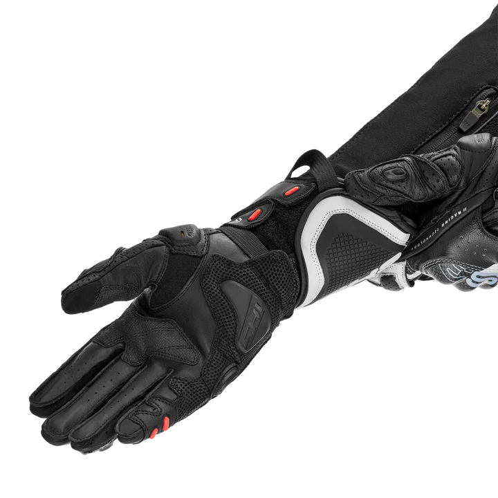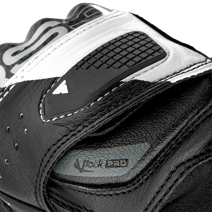 Made of durable goat leather and reinforced with Superlastic and durable kangarooine in the palm. They are loaded with carbon fiber reinforced knuckle protection, SAP hand slides, Mini slides at the little finger and Armorplus stuffing on sensitive zones. The pre-formed fingers with Fingerbro between ring and little finger protect the hand when contacting the asphalt.