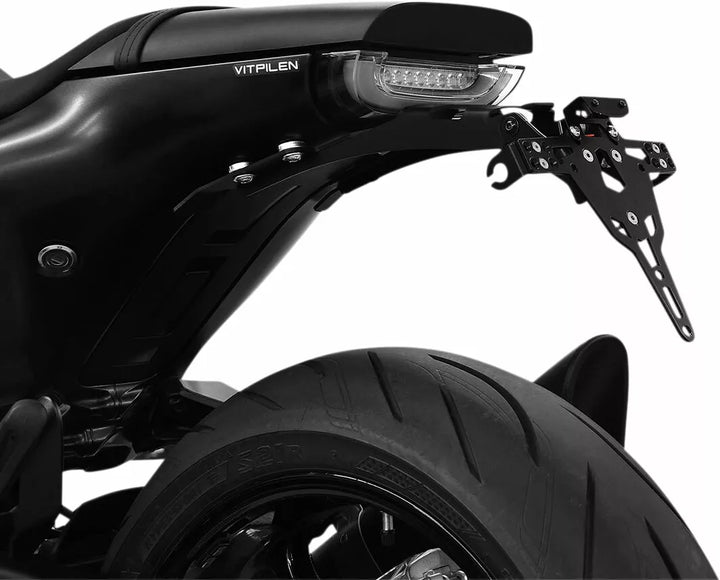 The License Plate Holder is Extremely Durable and Weather Proof., Black Powder Coated. , The License Plate Holder Can Be Used For Any Kind of License Plate (175mm Width)., No Modification of Fairing Required., Stepless Adjustment of Rake Angle., Indicator Support Adjustable in 3 Positions. Plate., Special Indicator Light Mounts (Sold Separately) Required for Stock Indicator Lights., Kit Includes: 1 License Plate Holder Incl. Mounting Kit., LED License Plate Light "e Approved" Incl. Support., Back Light With Support.